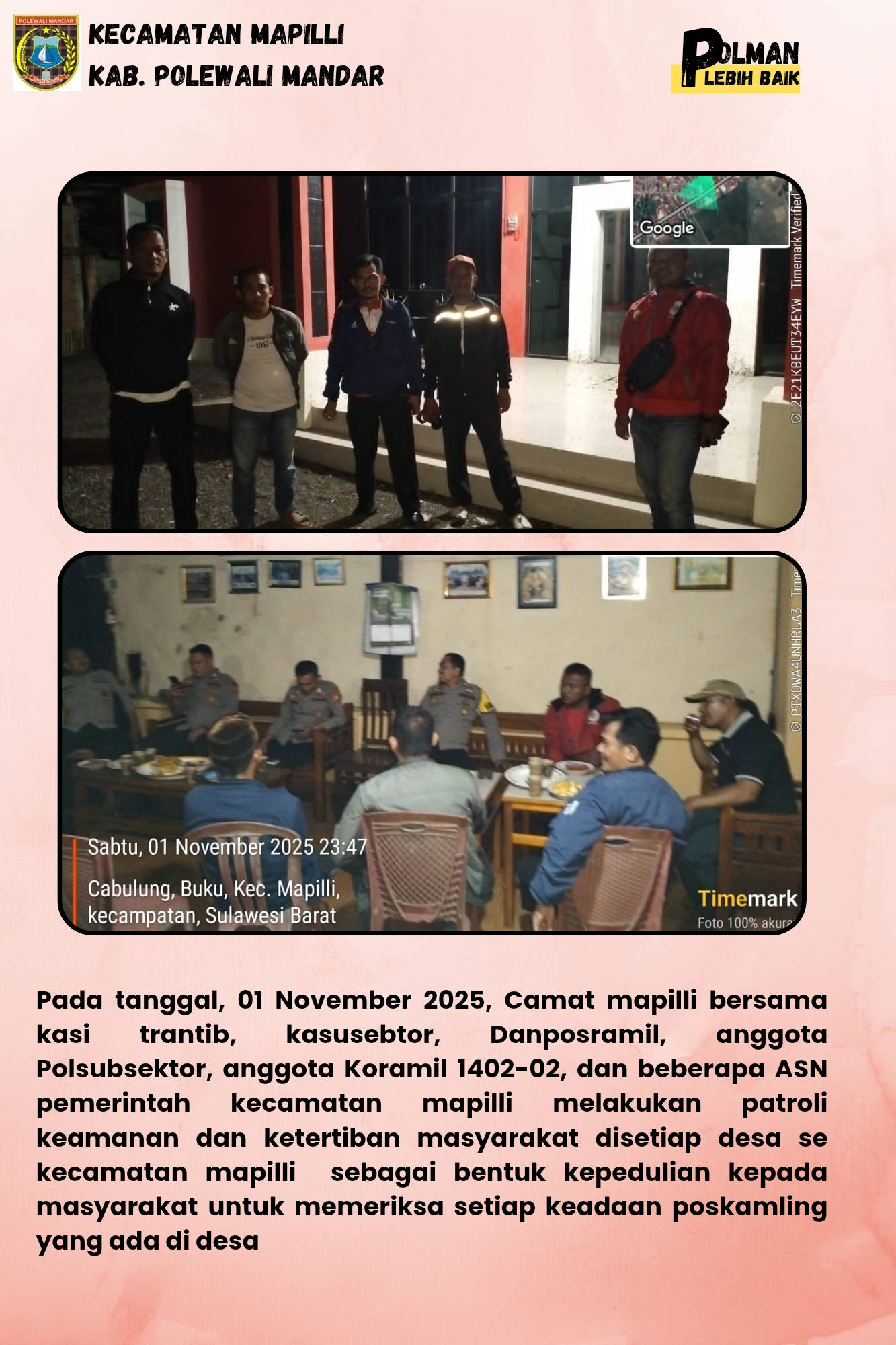 Pada tanggal, 01 November 2025, Camat mapilli bersama kasi trantib, kasusebtor, Danposramil, anggota Polsubsektor, anggota Koramil 1402-02, dan beberapa ASN pemerintah kecamatan mapilli melakukan kunjungan patroli keamanan dan ketertiban masyarakat di desa se kecamatan mapilli sesuai jadwal yang telah ditentukan sebagai bentuk kepedulian kepada masyarakat untuk memeriksa setiap keadaan poskamling yang ada di desa...