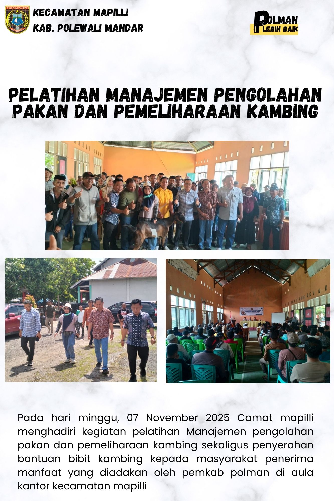 Pada hari minggu, 07 Desember 2025 Camat mapilli menghadiri kegiatan pelatihan Manajemen pengolahan pakan dan pemeliharaan kambing sekaligus penyerahan bantuan bibit kambing kepada masyarakat penerima manfaat yang diadakan oleh pemkab polman di aula kantor kecamatan mapilli...
